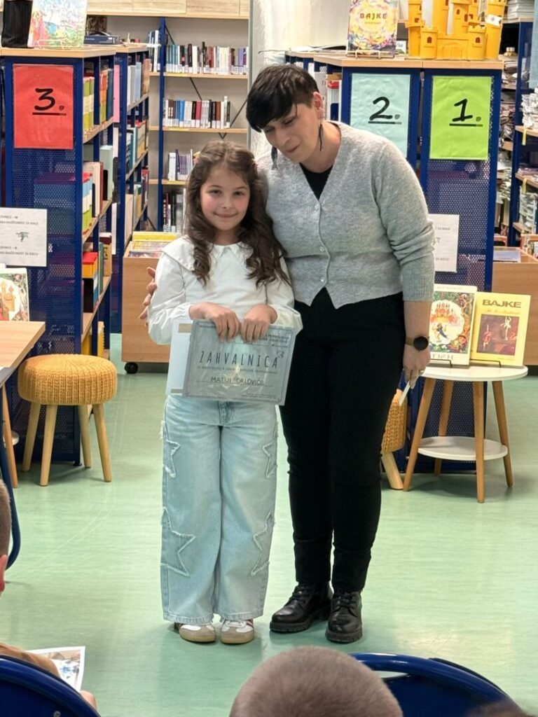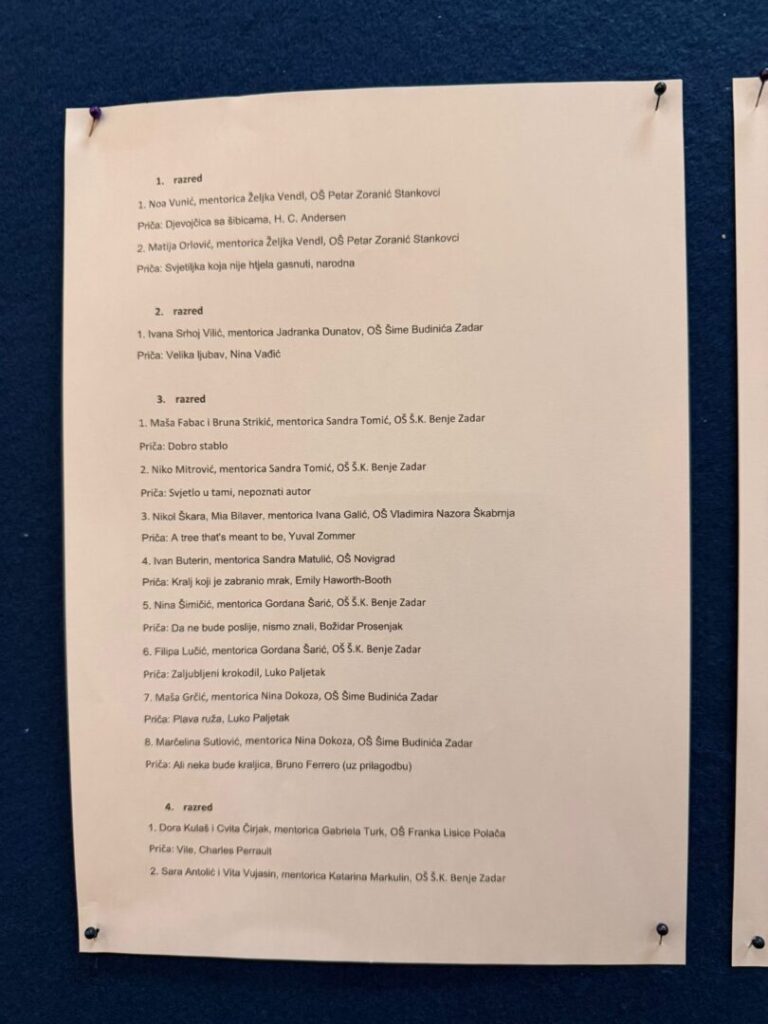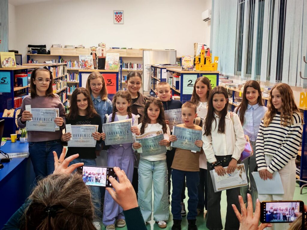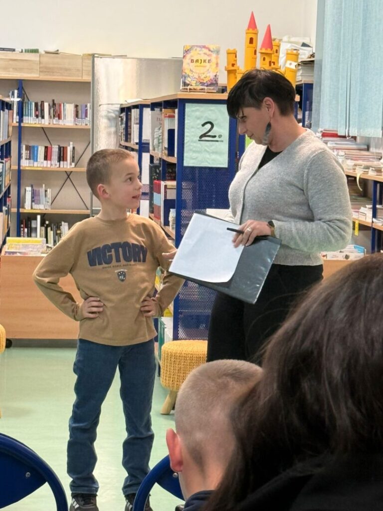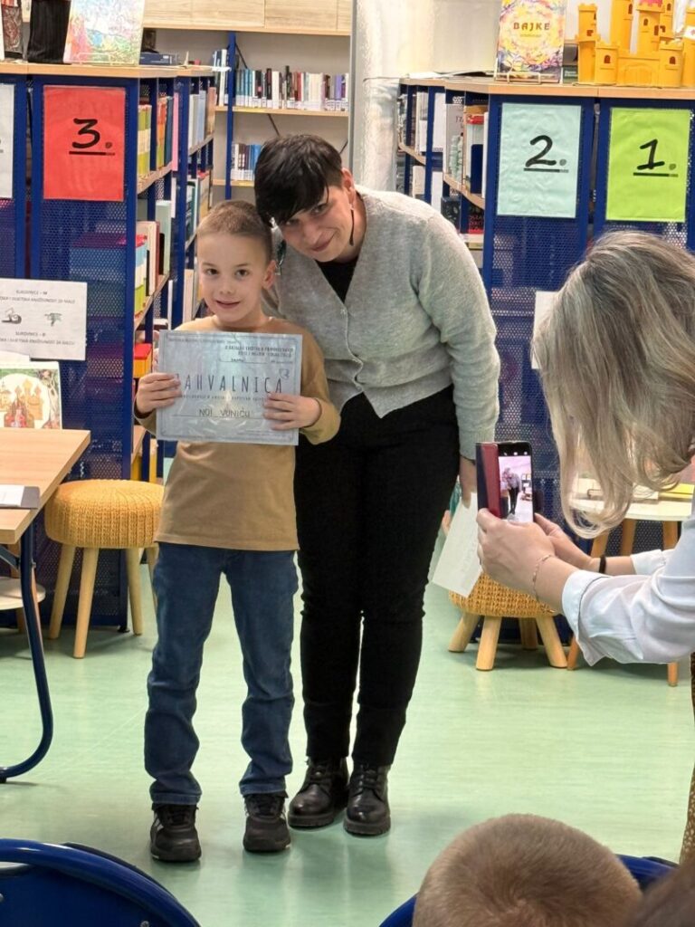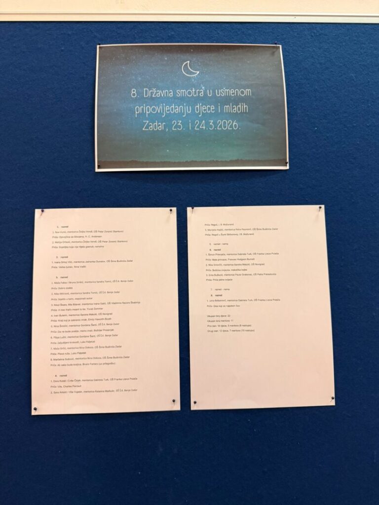 Prvaši Matija Orlović i Noa Vunić sa svojom mentricom i učiteljicom Željkom Vendl sinoć su sudjelovali u Državnoj smotri pripovijedanja. Oboje su fantastičnim nastupom i s ponosom predstavljali našu školu. Smotra je održana u OŠ “Zadarski otoci” u Zadru 24. ožujka 2026. godine.
